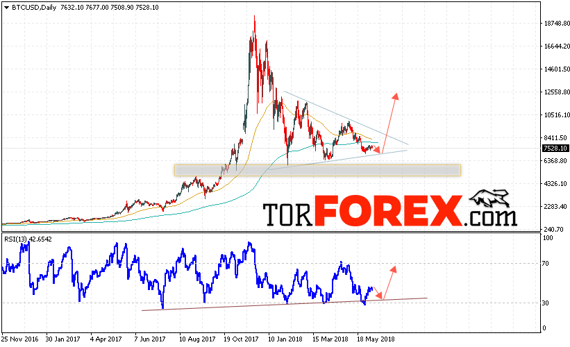 Таким образом, Bitcoin прогноз курса на неделю 11 — 15 июня 2018 предполагает попытку теста области поддержки вблизи уровня 7200 и продолжения роста в область выше уровня 12500, дополнительным сигналом в пользу роста Bitcoin выступит тест линии поддержки на индикаторе относительной силы.