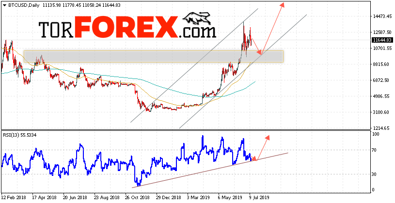 В пользу подъёма котировок BTC/USD на текущей торговой неделе 15 — 19 июля 2019 выступит тест восходящей линии тренда на индикаторе относительной силы. Вторым сигналом станет отскок от нижней границы восходящего канала. Отменой варианта роста Bitcoin станет падение и пробой области 8650. Это укажет на пробой нижней границы восходящего канала и продолжение падения BTC/USD с потенциальной целью ниже уровня 5650. Подтверждением развития восходящей тенденции выступит пробой области сопротивления и закрытие котировок выше уровня 13250. Не стоит исключат формирования модели «Треугольник» на текущий уровнях.