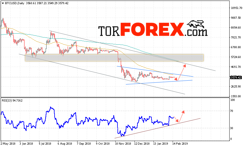 В пользу подъёма котировок BTC/USD на текущей торговой неделе 18 — 22 февраля 2019 выступит тест восходящей линии тренда на индикаторе относительной силы. Отменой варианта роста Bitcoin станет падение и пробой области 3050. Это укажет на пробой нижней границы модели «Треугольник» и продолжение падения BTC/USD с потенциальной целью ниже уровня 2000. Подтверждением развития восходящей тенденции выступит пробой верхней границы модели «Треугольник» и закрытие котировок выше уровня 3850.