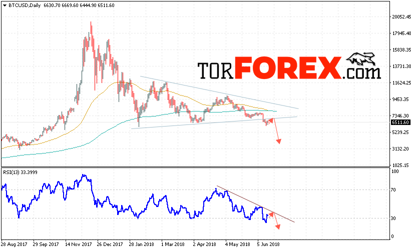 Таким образом, Bitcoin прогноз курса на неделю 18 — 22 июня 2018 предполагает попытку теста нижней границы модели «Треугольник» вблизи уровня 7000 и продолжения падения в область ниже уровня 4000, дополнительным сигналом в пользу падения Bitcoin выступит тест линии тренда на индикаторе относительной силы.