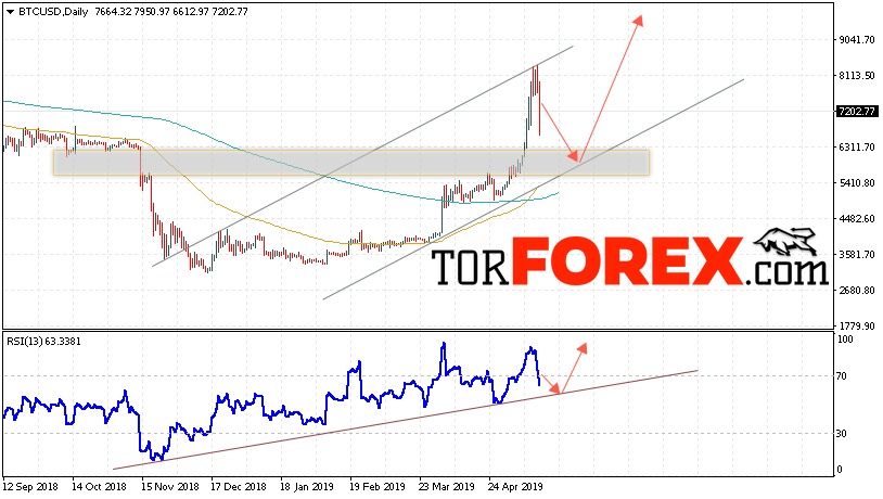 В пользу подъёма котировок BTC/USD на текущей торговой неделе 20 — 24 мая 2019 выступит тест восходящей линии тренда на индикаторе относительной силы. Вторым сигналом станет отскок от нижней границы восходящего канала. Отменой варианта роста Bitcoin станет падение и пробой области 5150. Это укажет на пробой нижней границы восходящего канала и продолжение падения BTC/USD с потенциальной целью ниже уровня 4150. Подтверждением развития восходящей тенденции выступит пробой области сопротивления и закрытие котировок выше уровня 8150.