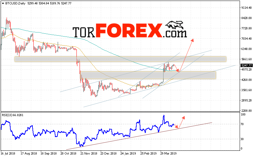 Таким образом, Bitcoin прогноз курса на неделю 22 — 26 апреля 2019 предполагает попытку области поддержки вблизи уровня 4850. Затем продолжение роста криптовалюты в область выше уровня 7035. Дополнительным сигналом в пользу подъёма курса Bitcoin выступит тест линии поддержки на индикаторе относительной силы. Отменой варианта роста котировок криптовалюты Bitcoin выступит падение и пробой области 4150. В этом случае стоит ожидать продолжение снижения.