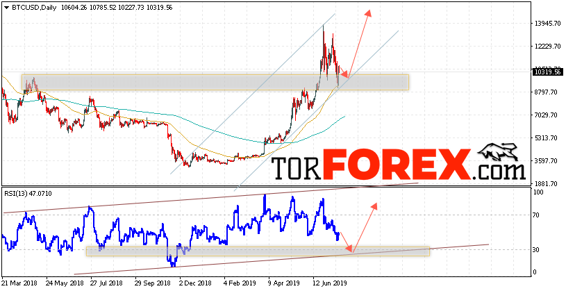 В пользу подъёма котировок BTC/USD на текущей торговой неделе 22 — 26 июля 2019 выступит тест восходящей линии тренда на индикаторе относительной силы. Вторым сигналом станет отскок от нижней границы восходящего канала. Отменой варианта роста Bitcoin станет падение и пробой области 8450. Это укажет на пробой нижней границы восходящего канала и продолжение падения BTC/USD с потенциальной целью ниже уровня 5650. Подтверждением развития восходящей тенденции выступит пробой области сопротивления и закрытие котировок выше уровня 12850.
