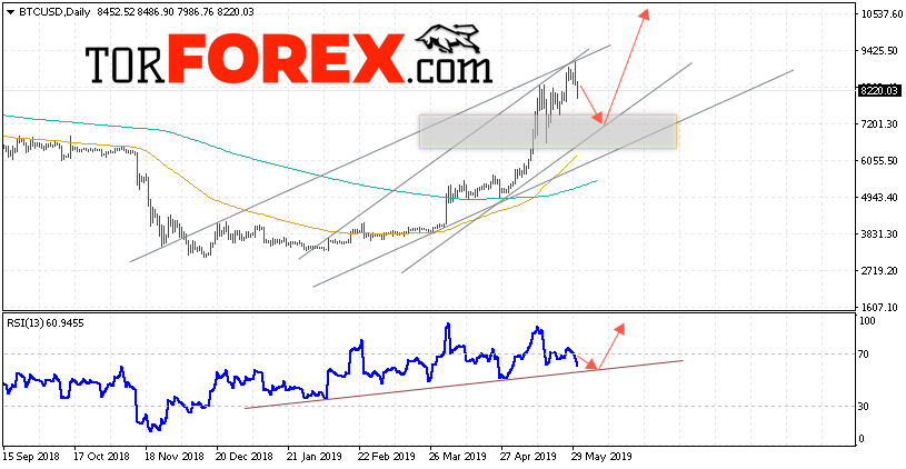 В пользу подъёма котировок BTC/USD на текущей торговой неделе 3 — 7 июня 2019 выступит тест восходящей линии тренда на индикаторе относительной силы, значения индикатора уже отталкивались от данной линии. Вторым сигналом станет отскок от нижней границы восходящего канала. Отменой варианта роста Bitcoin станет падение и пробой области 6050. Это укажет на пробой нижней границы восходящего канала и продолжение падения BTC/USD с потенциальной целью ниже уровня 4850. Подтверждением развития восходящей тенденции выступит пробой области сопротивления и закрытие котировок выше уровня 9425.