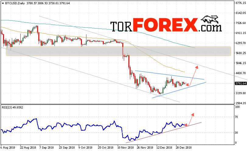 Таким образом, Bitcoin прогноз курса на неделю 7 — 11 января 2019 предполагает попытку области поддержки вблизи уровня 3650. Затем продолжение роста криптовалюты в область выше уровня 5000. Дополнительным сигналом в пользу роста курса Bitcoin выступит тест линии поддержки на индикаторе относительной силы. Отменой варианта роста котировок криптовалюты Bitcoin выступит падение и пробой области 3250. В этом случае стоит ожидать продолжение снижения.