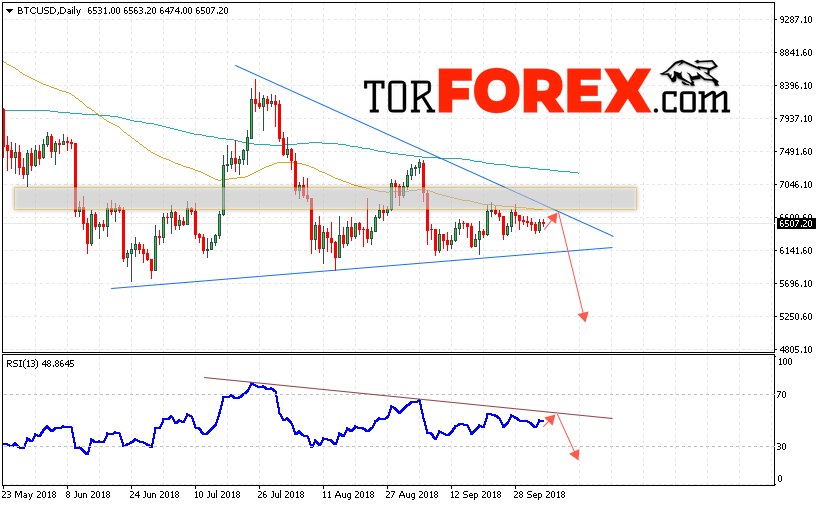 Таким образом, Bitcoin прогноз курса на неделю 8 — 12 октября 2018 предполагает попытку области сопротивления вблизи уровня 6650 и продолжения падения криптовалюты в область ниже уровня 5200, дополнительным сигналом в пользу снижения курса Bitcoin выступит тест области сопротивления на индикаторе относительной силы, отменой варианта падения котировок криптовалюты Bitcoin выступит сильный рост и пробой области 7100, в этом случае стоит ожидать продолжение роста.