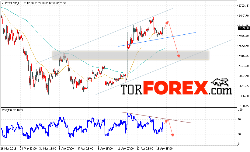 Таким образом, Bitcoin прогноз курса и аналитика на 18 апреля 2018 предполагает попытку теста уровня сопротивления вблизи области 8300 и продолжения падения с потенциальной целью на уровне 7450, дополнительным сигналом в пользу падения Bitcoin выступит тест линии тренда на индикаторе относительной силы, отменой варианта падения котировок станет сильный рост и пробой области 8450.
