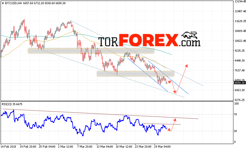 Таким образом, Bitcoin прогноз курса и аналитика на 2 апреля 2018 предполагает попытку теста области сопротивления вблизи уровня 6850 и продолжения падения с потенциальной целью на уровне 5400, дополнительным сигналом в пользу падения Bitcoin выступит тест линии тренда на индикаторе относительной силы, отменой варианта снижения котировок станет сильный рост и пробой области 7600.
