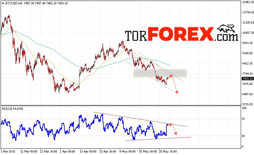 Таким образом, Bitcoin прогноз курса и аналитика на 31 мая 2018 предполагает попытку теста уровня сопротивления вблизи области 7550 и продолжения падения с потенциальной целью на уровне 6400, дополнительным сигналом в пользу падения Bitcoin выступит тест линии тренда на индикаторе относительной силы, отменой варианта снижения котировок криптовалюты станет сильный рост и пробой области 7800, в этом случае стоит ожидать продолжения роста Bitcoin с потенциальной целью вблизи области 10400.