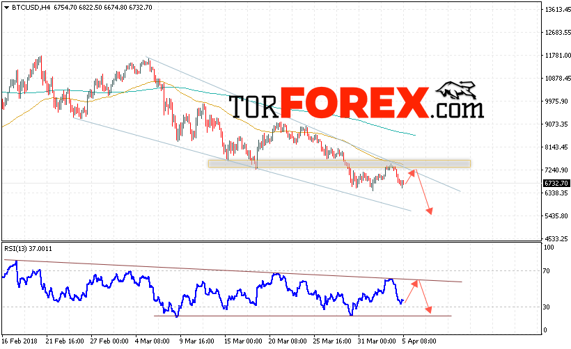 Таким образом, Bitcoin прогноз курса и аналитика на 6 апреля 2018 предполагает попытку теста области сопротивления вблизи уровня 7200 и продолжения падения с потенциальной целью на уровне 5500, дополнительным сигналом в пользу падения Bitcoin выступит тест линии тренда на индикаторе относительной силы, отменой варианта снижения котировок станет сильный рост и пробой области 7800.