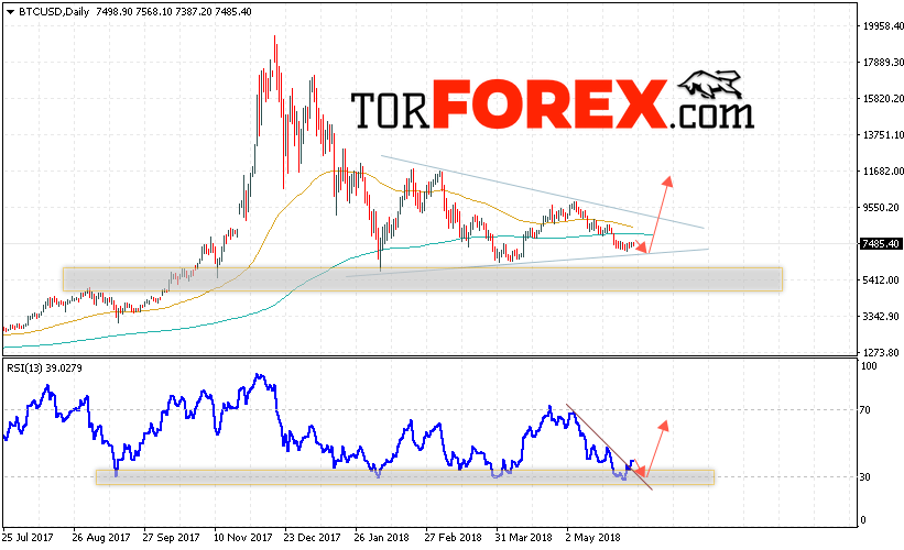 Таким образом, Bitcoin прогноз курса на неделю 4 — 8 июня 2018 предполагает попытку теста области поддержки вблизи уровня 7200 и продолжения роста в область выше уровня 11500, дополнительным сигналом в пользу роста Bitcoin выступит тест линии поддержки на индикаторе относительной силы.