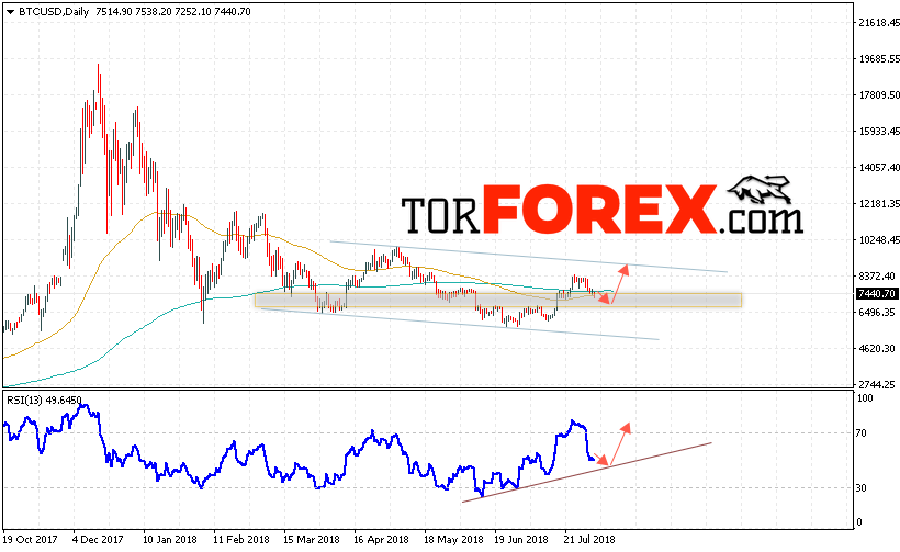 В пользу роста котировок BTC/USD выступит тест линии тренда на индикаторе относительной силы. Отменой варианта роста Bitcoin станет падение и пробой области 6000, что укажет на пробой области поддержки и продолжение падения BTC/USD ниже уровня 4700. Подтверждением развития восходящей тенденции выступит пробой верхней границы нисходящего канала и закрытие котировок выше уровня 9700.
