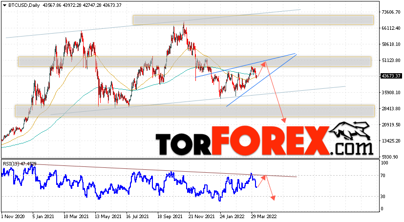Дополнительным сигналом в пользу снижения котировок BTC/USD на текущей торговой неделе 11 — 15 апреля 2022 выступит отскок от верхней границы разворотной модели ”Клин”. Вторым сигналом станет отскок от линии сопротивления на индикаторе относительной силы (RSI). Отменой варианта падения Bitcoin станет сильный рост и пробой области 56005. Это укажет на пробой области сопротивления и продолжение подъёма котировок BTC/USD с потенциальной целью выше уровня 61055. Подтверждением развития нисходящего движения выступит пробой области поддержки и закрытие котировок ниже уровня 35805, что укажет на пробой нижней границы разворотной модели ”Клин”.