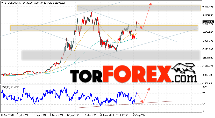 Таким образом, Биткоин прогноз и аналитика на 11 — 15 октября 2021 предполагает попытку области поддержки вблизи уровня 47055. Затем продолжение подъёма криптовалюты в область выше уровня 70055. Дополнительным сигналом в пользу роста курса Bitcoin на текущей торговой неделе выступит тест линии тренда на индикаторе относительной силы. Отменой варианта подъёма котировок криптовалюты Bitcoin выступит падение и пробой области 36055. В этом случае стоит ожидать продолжение снижения с целью на уровне 28055.