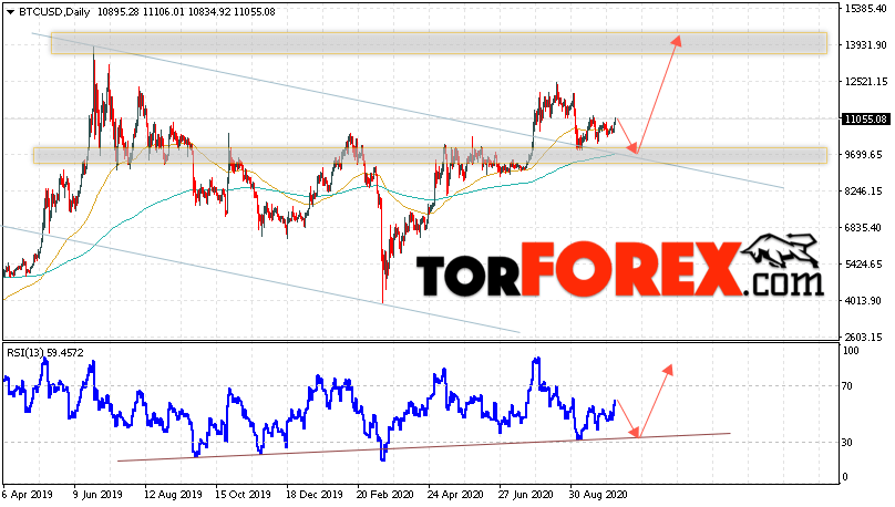 Таким образом, Биткоин прогноз и аналитика на 12 — 16 октября 2020 предполагает попытку области поддержки вблизи уровня 9855. Затем продолжение роста криптовалюты в область выше уровня 13965. Дополнительным сигналом в пользу подъёма курса Bitcoin на текущей торговой неделе выступит тест линии поддержки на индикаторе относительной силы. Отменой варианта роста котировок криптовалюты Bitcoin выступит падение и пробой области 8245. В этом случае стоит ожидать продолжение падения с целью на уровне 6755.