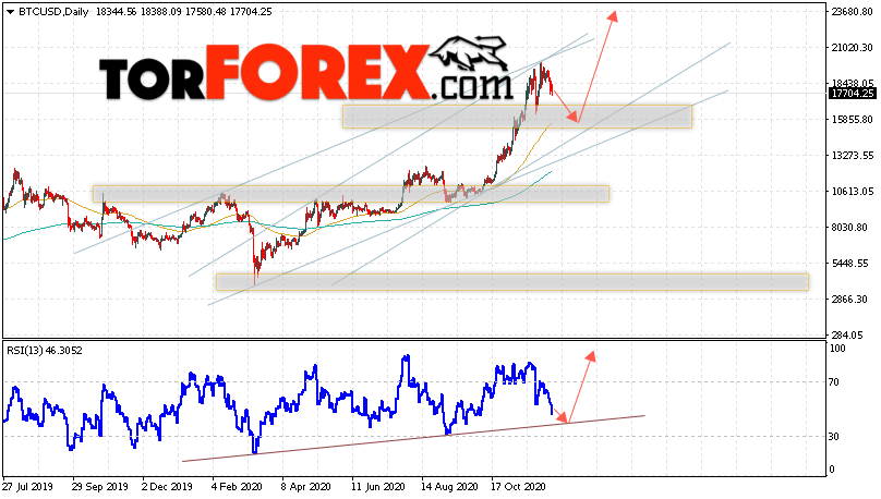 Дополнительным сигналом в пользу подъёма котировок BTC/USD на текущей торговой неделе 14 — 18 декабря 2020 выступит отскок от нижней границы восходящего канала. Вторым сигналом станет отскок от линии поддержки на индикаторе RSI. Отменой варианта роста Bitcoin станет падение и пробой области 13055. Это укажет на пробой области поддержки и продолжение падения котировок BTC/USD с потенциальной целью ниже уровня 11055. Подтверждением развития восходящей тенденции выступит пробой области сопротивления и закрытие котировок выше уровня 21155.
