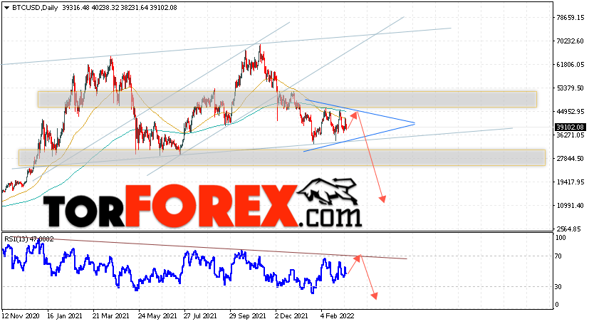 Дополнительным сигналом в пользу снижения котировок BTC/USD на текущей торговой неделе 14 — 18 марта 2022 выступит отскок от верхней границы модели ”Треугольник”. Вторым сигналом станет отскок от линии сопротивления на индикаторе относительной силы (RSI). Отменой варианта падения Bitcoin станет сильный рост и пробой области 51605. Это укажет на пробой области сопротивления и продолжение подъёма котировок BTC/USD с потенциальной целью выше уровня 55605. Подтверждением развития нисходящего движения выступит пробой области поддержки и закрытие котировок ниже уровня 32405, что укажет на пробой нижней границы бычьего канала, а также не пробой нижней границы модели ”Треугольник”.