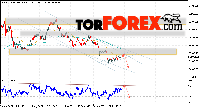Дополнительным сигналом в пользу падения котировок BTC/USD на текущей торговой неделе 15 — 19 августа 2022 выступит отскок от верхней границы нисходящего канала. Вторым сигналом станет отскок от линии сопротивления на индикаторе относительной силы (RSI). Отменой варианта падения Bitcoin станет сильный рост и пробой области 30505. Это укажет на пробой области сопротивления и продолжение роста котировок BTC/USD с потенциальной целью выше уровня 37405. Подтверждением развития нисходящего движения выступит пробой области поддержки и закрытие котировок ниже уровня 19105, что укажет на пробой нижней границы нисходящей модели ”Нисходящий Флаг”.