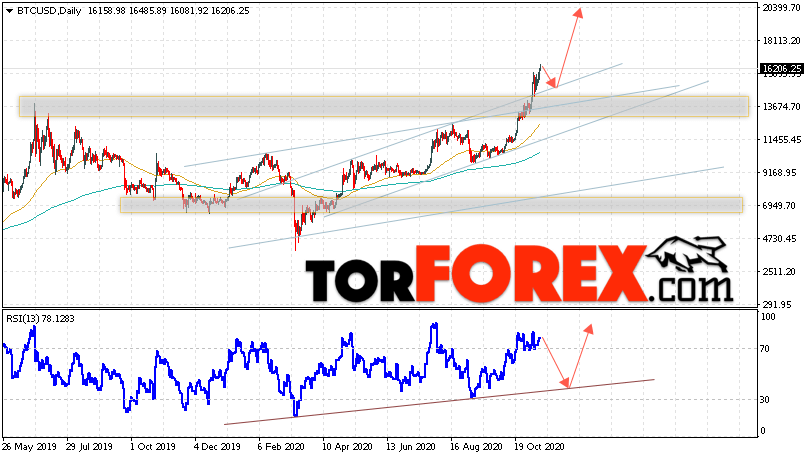 Дополнительным сигналом в пользу подъёма котировок BTC/USD на текущей торговой неделе 16 — 20 ноября 2020 выступит отскок от верхней границы восходящего канала. Вторым сигналом станет отскок от линии поддержки на индикаторе RSI. Отменой варианта роста Bitcoin станет падение и пробой области 12405. Это укажет на пробой области поддержки и продолжение падения котировок BTC/USD с потенциальной целью ниже уровня 9505. Подтверждением развития восходящей тенденции выступит пробой области сопротивления и закрытие котировок выше уровня 16755.