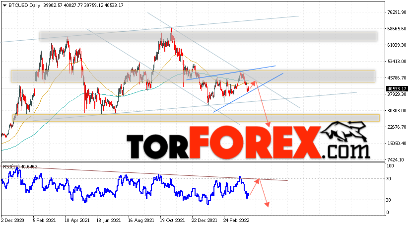 Дополнительным сигналом в пользу снижения котировок BTC/USD на текущей торговой неделе 18 — 22 апреля 2022 выступит отскок от верхней границы разворотной модели ”Клин”. Вторым сигналом станет отскок от линии сопротивления на индикаторе относительной силы (RSI). Отменой варианта падения Bitcoin станет сильный рост и пробой области 54055. Это укажет на пробой области сопротивления и продолжение подъёма котировок BTC/USD с потенциальной целью выше уровня 59505. Подтверждением развития нисходящего движения выступит пробой области поддержки и закрытие котировок ниже уровня 35205, что укажет на пробой нижней границы разворотной модели ”Клин”.
