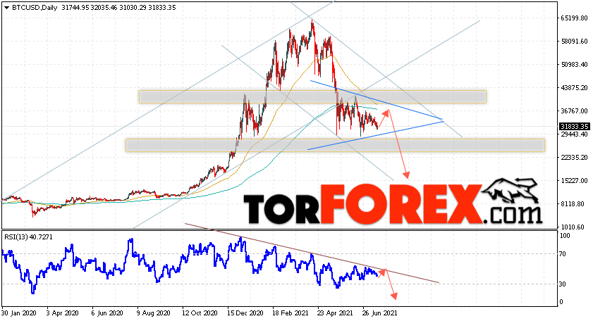 Дополнительным сигналом в пользу падения котировок BTC/USD на текущей торговой неделе 19 — 23 июля 2021 выступит отскок от верхней границы модели ”Треугольник”. Вторым сигналом станет отскок от нисходящей линии тренда на индикаторе относительной силы (RSI). Отменой варианта снижение Bitcoin станет сильный рост и пробой области 45355. Это укажет на пробой области сопротивления и продолжение подъёма котировок BTC/USD с потенциальной целью выше уровня 60255. Подтверждением развития нисходящего движения выступит пробой области поддержки и закрытие котировок ниже уровня 23505, что укажет на пробой нижней границы модели ”Треугольник”.