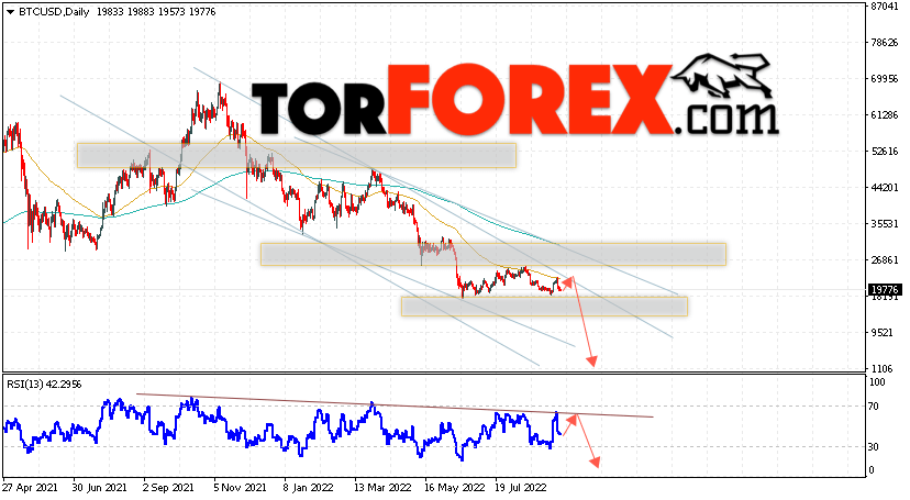 Дополнительным сигналом в пользу падения котировок BTC/USD на текущей торговой неделе 19 — 23 сентября 2022 выступит отскок от верхней границы нисходящего канала. Вторым сигналом станет отскок от линии сопротивления на индикаторе относительной силы (RSI). Отменой варианта падения Bitcoin станет сильный рост и пробой области 27505. Это укажет на пробой области сопротивления и продолжение роста котировок BTC/USD с потенциальной целью выше уровня 33405. Подтверждением развития нисходящего движения выступит пробой области поддержки и закрытие котировок ниже уровня 18705, пока от этой области был два отскока вверху.