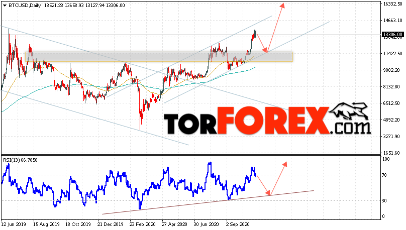 Дополнительным сигналом в пользу подъёма котировок BTC/USD на текущей торговой неделе 2 — 6 ноября 2020 выступит отскок от нижней границы восходящего канала. Вторым сигналом станет отскок от линии поддержки на индикаторе RSI. Отменой варианта роста Bitcoin станет падение и пробой области 11005. Это укажет на пробой области поддержки и продолжение падения котировок BTC/USD с потенциальной целью ниже уровня 9405. Подтверждением развития восходящей тенденции выступит пробой области сопротивления и закрытие котировок выше уровня 13965.