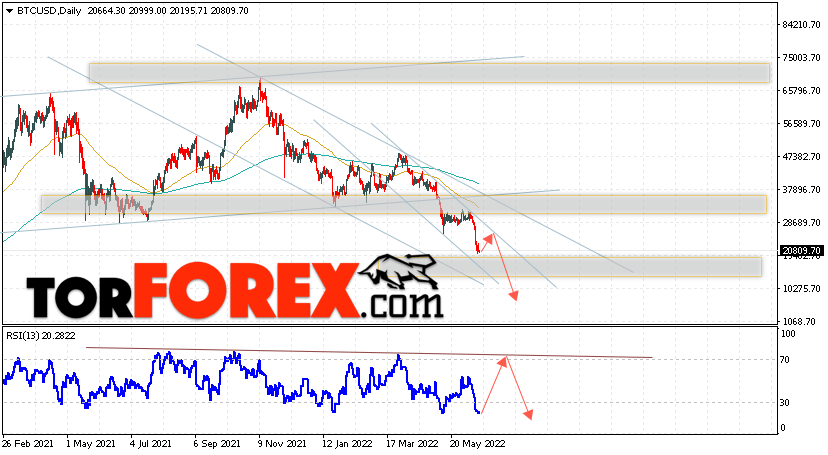 Дополнительным сигналом в пользу падения котировок BTC/USD на текущей торговой неделе 20 — 24 июня 2022 выступит отскок от верхней границы нисходящего канала. Вторым сигналом станет отскок от линии сопротивления на индикаторе относительной силы (RSI). Отменой варианта падения Bitcoin станет сильный рост и пробой области 29505. Это укажет на пробой области сопротивления и продолжение роста котировок BTC/USD с потенциальной целью выше уровня 33505. Подтверждением развития нисходящего движения выступит пробой области поддержки и закрытие котировок ниже уровня 19055.