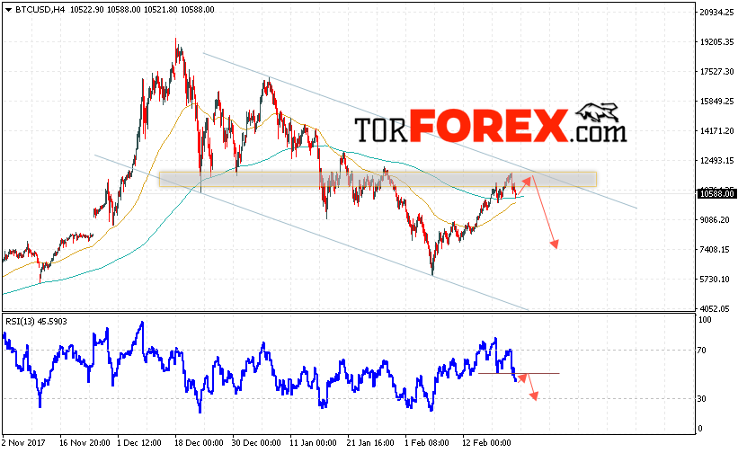 Таким образом, Биткоин прогноз и аналитика на 22 февраля 2018 предполагает попытку теста области сопротивления вблизи уровня 11750 и продолжения падения с потенциальной целью на уровне 7400, дополнительным сигналом в пользу падения Bitcoin выступит тест линии сопротивления на индикаторе относительной силы, отменой варианта падения станет сильный рост и пробой области 12500.