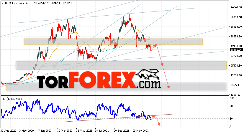 Дополнительным сигналом в пользу снижения котировок BTC/USD на текущей торговой неделе 24 — 28 января 2022 выступит отскок от нижней границы бычьего канала. Вторым сигналом станет отскок от линии сопротивления на индикаторе относительной силы (RSI), линия выглядит очень агрессивной потому что располагается внизу и если падения будет, то оно также может быть очень сильным снижение актива. Отменой варианта падения Bitcoin станет сильный рост и пробой области 57005. Это укажет на пробой области сопротивления и продолжение подъёма котировок BTC/USD с потенциальной целью выше уровня 72505. Подтверждением развития нисходящего движения выступит пробой области поддержки и закрытие котировок ниже уровня 30055, что укажет на пробой важной поддержки. Причем пробой такого уровня укажет на формирования разворотной модели ”Двойная вершина” с более низкими целями падения котировок ведущего цифрового актива.