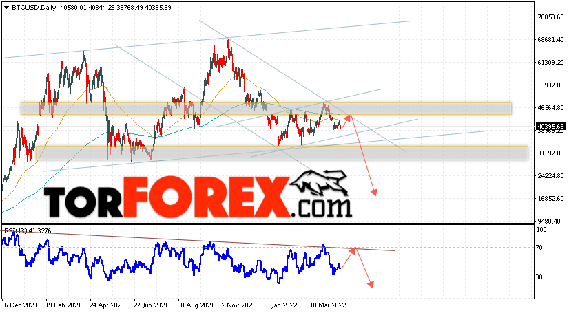 Дополнительным сигналом в пользу снижения котировок BTC/USD на текущей торговой неделе 25 — 29 апреля 2022 выступит отскок от верхней границы нисходящего канала. Вторым сигналом станет отскок от линии сопротивления на индикаторе относительной силы (RSI). Отменой варианта падения Bitcoin станет сильный рост и пробой области 54005. Это укажет на пробой области сопротивления и продолжение подъёма котировок BTC/USD с потенциальной целью выше уровня 59505. Подтверждением развития нисходящего движения выступит пробой области поддержки и закрытие котировок ниже уровня 30405, что укажет на пробой нижней границы долгосрочного восходящего канала.