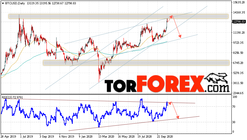 Дополнительным сигналом в пользу падения котировок BTC/USD на текущей торговой неделе 26 — 30 октября 2020 выступит отскок от верхней границы восходящего канала. Вторым сигналом станет отскок от линии сопротивления на индикаторе RSI. Отменой варианта падения Bitcoin станет сильный рост и пробой области 14255. Это укажет на пробой области сопротивления и продолжение роста котировок BTC/USD с потенциальной целью выше уровня 16505. Подтверждением развития нисходящей тенденции выступит пробой области поддержки и закрытие котировок ниже уровня 11055.