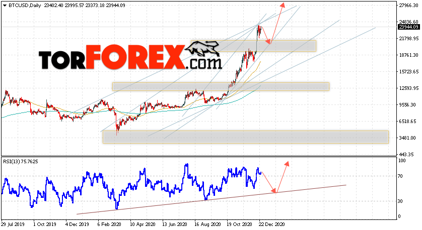 Дополнительным сигналом в пользу подъёма котировок BTC/USD на текущей торговой неделе 28 декабря 2020 — 1 января 2021 выступит отскок от нижней границы восходящего канала. Вторым сигналом станет отскок от линии поддержки на индикаторе RSI. Отменой варианта роста Bitcoin станет падение и пробой области 17505. Это укажет на пробой области поддержки и продолжение падения котировок BTC/USD с потенциальной целью ниже уровня 13505. Подтверждением развития восходящей тенденции выступит пробой области сопротивления и закрытие котировок выше уровня 25605.