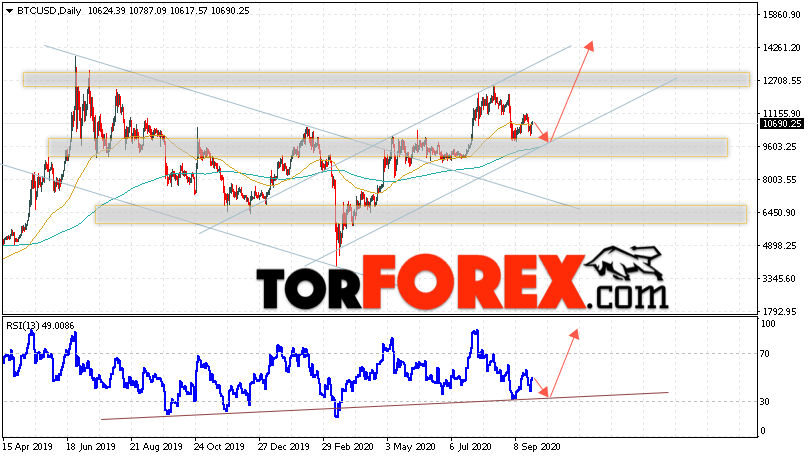 Дополнительным сигналом в пользу роста котировок BTC/USD на текущей торговой неделе 28 сентября — 2 октября 2020 выступит отскок от нижней границы восходящего канала. Вторым сигналом станет отскок от линии поддержки на индикаторе относительной силы. Отменой варианта роста Bitcoin станет падение и пробой области 8285. Это укажет на пробой области поддержки и продолжение падения котировок BTC/USD с потенциальной целью ниже уровня 6345. Подтверждением развития восходящей тенденции выступит пробой области сопротивления и закрытие котировок выше уровня 11705.