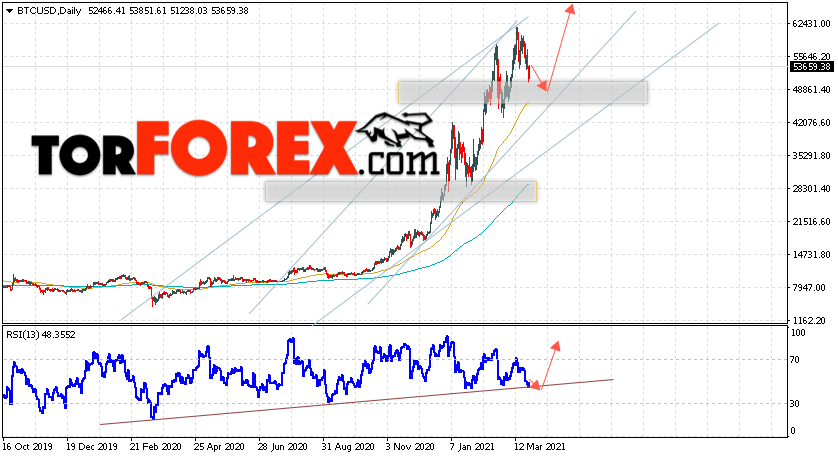Дополнительным сигналом в пользу подъёма котировок BTC/USD на текущей торговой неделе неделю 29 марта — 2 апреля 2021 выступит отскок от нижней границы восходящего канала. Вторым сигналом станет отскок от линии поддержки на индикаторе относительно силы (RSI). Отменой варианта роста Bitcoin станет падение и пробой области 41025. Это укажет на пробой области поддержки и продолжение падения котировок BTC/USD с потенциальной целью ниже уровня 35405. Подтверждением развития восходящей тенденции выступит пробой области сопротивления и закрытие котировок выше уровня 62605.