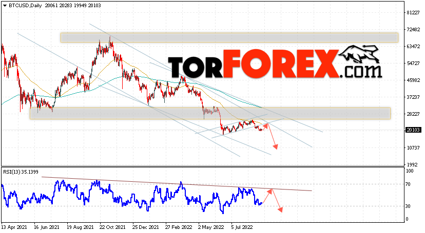 Дополнительным сигналом в пользу падения котировок BTC/USD на текущей торговой неделе 5 — 9 сентября 2022 выступит отскок от верхней границы нисходящего канала. Вторым сигналом станет отскок от линии сопротивления на индикаторе относительной силы (RSI). Отменой варианта падения Bitcoin станет сильный рост и пробой области 28605. Это укажет на пробой области сопротивления и продолжение роста котировок BTC/USD с потенциальной целью выше уровня 35025. Подтверждением развития нисходящего движения выступит пробой области поддержки и закрытие котировок ниже уровня 18505.