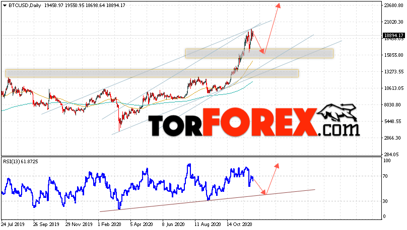 Дополнительным сигналом в пользу подъёма котировок BTC/USD на текущей торговой неделе 7 — 11 декабря 2020 выступит отскок от нижней границы восходящего канала. Вторым сигналом станет отскок от линии поддержки на индикаторе RSI. Отменой варианта роста Bitcoin станет падение и пробой области 13105. Это укажет на пробой области поддержки и продолжение падения котировок BTC/USD с потенциальной целью ниже уровня 11205. Подтверждением развития восходящей тенденции выступит пробой области сопротивления и закрытие котировок выше уровня 21105.