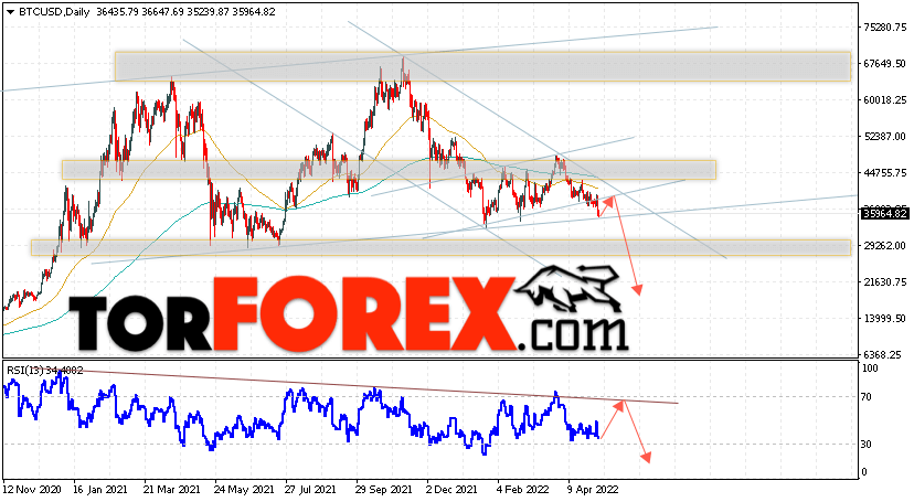Дополнительным сигналом в пользу снижения котировок BTC/USD на текущей торговой неделе 9 — 13 мая 2022 выступит отскок от верхней границы нисходящего канала. Вторым сигналом станет отскок от линии сопротивления на индикаторе относительной силы (RSI). Отменой варианта падения Bitcoin станет сильный рост и пробой области 49505. Это укажет на пробой области сопротивления и продолжение подъёма котировок BTC/USD с потенциальной целью выше уровня 56455. Подтверждением развития нисходящего движения выступит пробой области поддержки и закрытие котировок ниже уровня 33005, что укажет на пробой нижней границы долгосрочного восходящего канала.