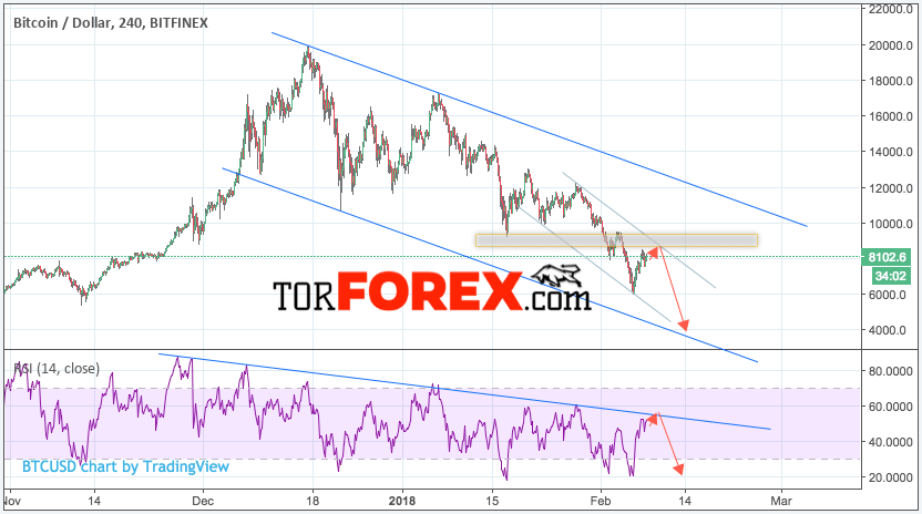 Таким образом, Биткоин прогноз и аналитика на 9 февраля 2018 предполагает попытку теста верхней границы канала вблизи 8700 и продолжения падения в область ниже уровня 4000, дополнительным сигналом в пользу падения Bitcoin выступит тест линии сопротивления на индикаторе относительной силы.