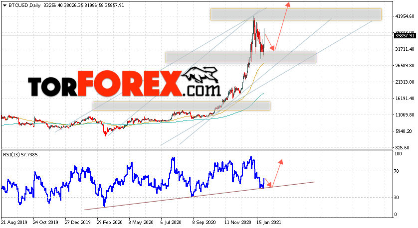 Дополнительным сигналом в пользу подъёма котировок BTC/USD на текущей торговой неделе 1 — 5 февраля 2021 выступит отскок от нижней границы восходящего канала. Вторым сигналом станет отскок от линии долгосрочной поддержки на индикаторе RSI. Отменой варианта роста Bitcoin станет падение и пробой области 26055. Это укажет на пробой области поддержки и продолжение падения котировок BTC/USD с потенциальной целью ниже уровня 18505. Подтверждением развития восходящей тенденции выступит пробой области сопротивления и закрытие котировок выше уровня 42455.