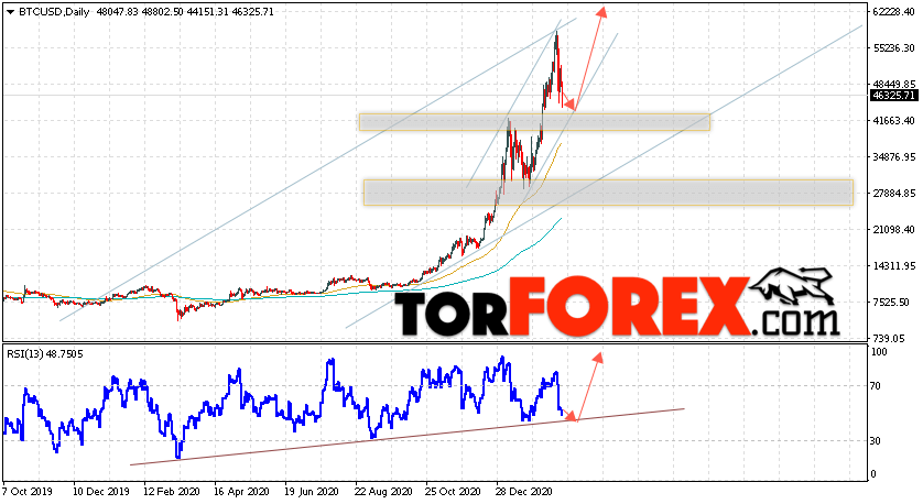 Дополнительным сигналом в пользу подъёма котировок BTC/USD на текущей торговой неделе неделю 1 — 5 марта 2021 выступит отскок от нижней границы восходящего канала. Вторым сигналом станет отскок от линии поддержки на индикаторе относительно силы (RSI). Отменой варианта роста Bitcoin станет падение и пробой области 35005. Это укажет на пробой области поддержки и продолжение падения котировок BTC/USD с потенциальной целью ниже уровня 28505. Подтверждением развития восходящей тенденции выступит пробой области сопротивления и закрытие котировок выше уровня 55305.