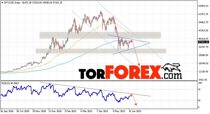 Дополнительным сигналом в пользу падения котировок BTC/USD на текущей торговой неделе неделю 14 — 18 июня 2021 выступит отскок от верхней границы нисходящего канала. Вторым сигналом станет отскок от нисходящей линии тренда на индикаторе относительной силы (RSI). Отменой варианта снижение Bitcoin станет сильный рост и пробой области 47005. Это укажет на пробой области сопротивления и продолжение подъёма котировок BTC/USD с потенциальной целью выше уровня 62505. Подтверждением развития нисходящего движения выступит пробой области поддержки и закрытие котировок ниже уровня 25605, что укажет на пробой нижней границы модели ”Треугольник”.