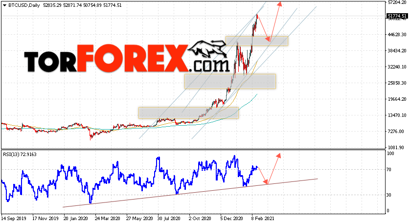 Дополнительным сигналом в пользу подъёма котировок BTC/USD на текущей торговой неделе неделю 22 — 26 февраля 2021 выступит отскок от нижней границы восходящего канала. Вторым сигналом станет отскок от линии поддержки на индикаторе относительно силы (RSI). Отменой варианта роста Bitcoin станет падение и пробой области 36405. Это укажет на пробой области поддержки и продолжение падения котировок BTC/USD с потенциальной целью ниже уровня 22505. Подтверждением развития восходящей тенденции выступит пробой области сопротивления и закрытие котировок выше уровня 54505.
