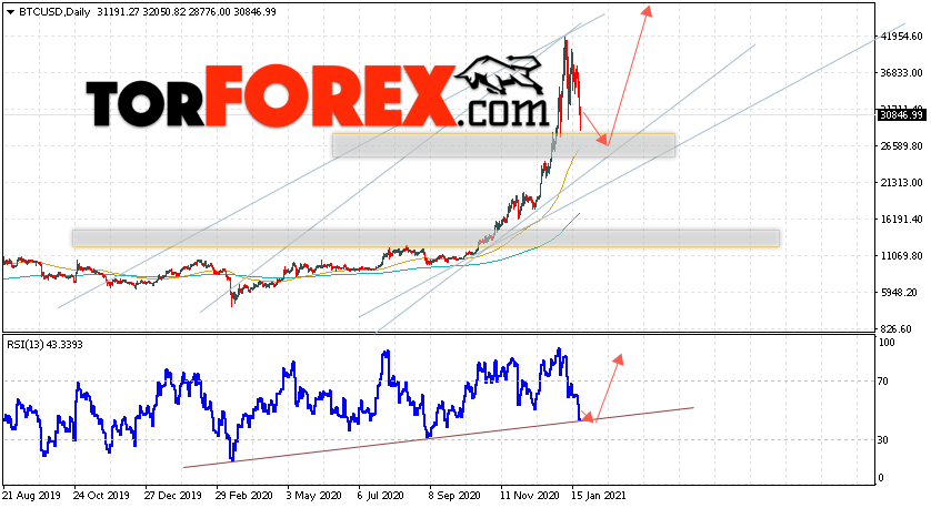 Дополнительным сигналом в пользу подъёма котировок BTC/USD на текущей торговой неделе неделю 25 — 29 января 2021 выступит отскок от нижней границы восходящего канала. Вторым сигналом станет отскок от линии долгосрочной поддержки на индикаторе RSI. Отменой варианта роста Bitcoin станет падение и пробой области 24505. Это укажет на пробой области поддержки и продолжение падения котировок BTC/USD с потенциальной целью ниже уровня 12505. Подтверждением развития восходящей тенденции выступит пробой области сопротивления и закрытие котировок выше уровня 37005.