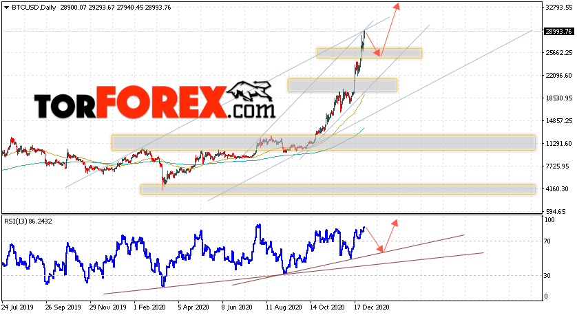 Дополнительным сигналом в пользу подъёма котировок BTC/USD на текущей торговой неделе неделю 4 — 8 января 2021 выступит отскок от нижней границы восходящего канала. Вторым сигналом станет отскок от линии поддержки на индикаторе RSI. Отменой варианта роста Bitcoin станет падение и пробой области 22405. Это укажет на пробой области поддержки и продолжение падения котировок BTC/USD с потенциальной целью ниже уровня 18605. Подтверждением развития восходящей тенденции выступит пробой области сопротивления и закрытие котировок выше уровня 25605.