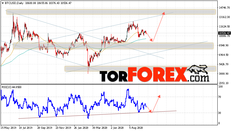 Bitcoin BTC/USD завершает торговую неделю на уровне 10690 и продолжают движение в рамках коррекции и восходящего канала. Скользящие средние указывают на наличие бычьей тенденции. Цены тестируют области между сигнальными линиями, что указывает на давление со стороны покупателей актива и потенциальное продолжение роста котировок актива. На данный момент стоит ожидать попытку развития коррекции и тест области поддержки вблизи уровня 8605. Откуда вновь стоит ожидать отскок и продолжение роста курса Bitcoin с потенциальной целью выше уровня 13650.