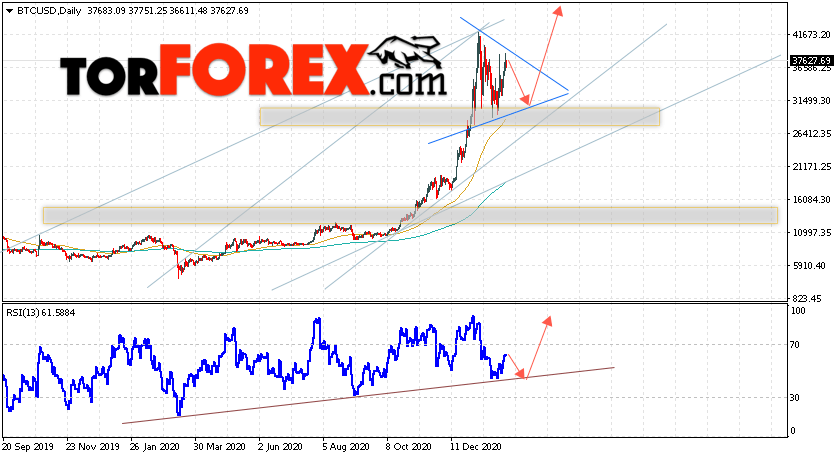 Дополнительным сигналом в пользу подъёма котировок BTC/USD на текущей торговой неделе неделю 8 — 12 февраля 2021 выступит отскок от нижней границы модели ”Треугольник”. Вторым сигналом станет отскок от линии долгосрочной поддержки на индикаторе RSI. Отменой варианта роста Bitcoin станет падение и пробой области 26105. Это укажет на пробой области поддержки и продолжение падения котировок BTC/USD с потенциальной целью ниже уровня 18755. Подтверждением развития восходящей тенденции выступит пробой области сопротивления и закрытие котировок выше уровня 42055, что укажет на пробой верхней границы модели ”Треугольник”.