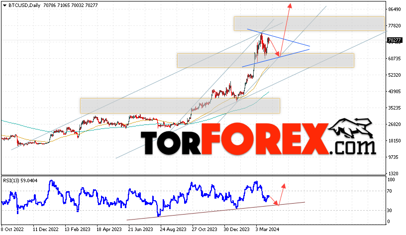 Дополнительным сигналом в пользу подъёма котировок BTC/USD на текущей торговой неделе 1 — 5 апреля 2024 выступит отскок от нижней границы модели «Треугольник». Вторым сигналом станет отскок от линии поддержки на индикаторе относительной силы (RSI). Отменой варианта роста Bitcoin станет падение и пробой области 54055. Это укажет на пробой области поддержки и продолжение падения котировок BTC/USD с потенциальной целью ниже уровня 46505. Подтверждением развития бычьего движения выступит пробой области сопротивления и закрытие котировок выше уровня 72305, что укажет на пробой верхней границы модели «Треугольник» и начало отработки паттерна с целями вверху.