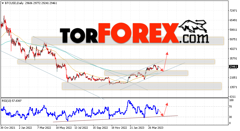 Дополнительным сигналом в пользу подъёма котировок BTC/USD на текущей торговой неделе 1 — 5 мая 2023 выступит отскок от нижней границы бычьего канала. Вторым сигналом станет отскок от линии поддержки на индикаторе относительной силы (RSI). Отменой варианта роста Bitcoin станет падение и пробой области 20865. Это укажет на пробой области поддержки и продолжение падения котировок BTC/USD с потенциальной целью ниже уровня 16545. Подтверждением развития бычьего движения выступит пробой области сопротивления и закрытие котировок выше уровня 36085, что укажет на пробой верхней границы бычьего канала, а это сигнал к росту на ширину канала.