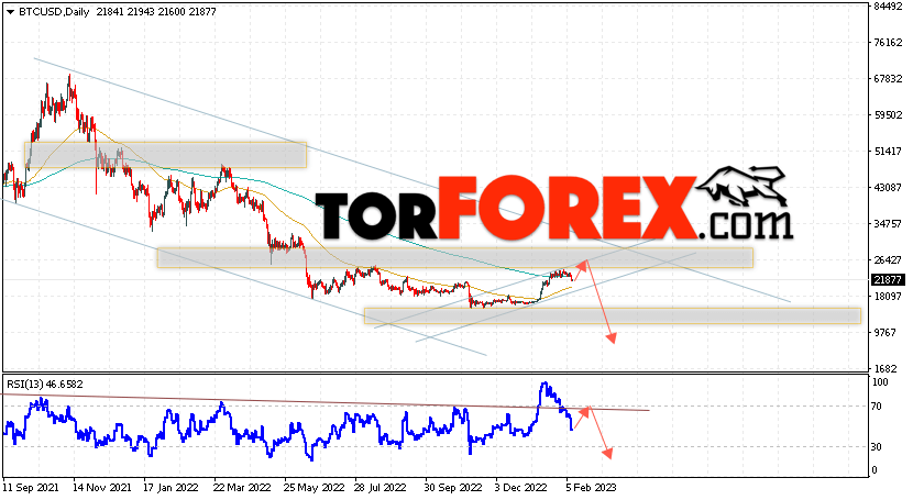 Дополнительным сигналом в пользу снижения котировок BTC/USD на текущей торговой неделе 13 — 17 февраля 2023 выступит отскок от верхней границы нисходящего канала. Вторым сигналом станет отскок от линии сопротивления на индикаторе относительной силы (RSI). Отменой варианта падения Bitcoin станет сильный рост и пробой области 32605. Это укажет на пробой области сопротивления и продолжение роста котировок BTC/USD с потенциальной целью выше уровня 37465. Подтверждением развития нисходящего движения выступит пробой области поддержки и закрытие котировок ниже уровня 18005, что укажет на пробой нижней границы бычьего канала коррекции.